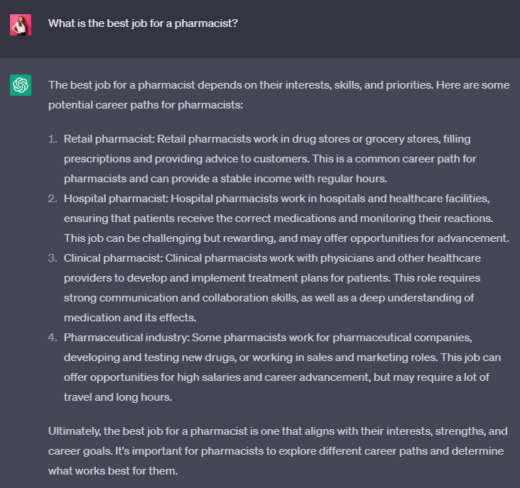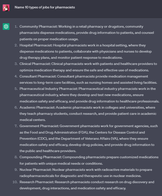 I like that ChatGPT mentions some of the lesser known jobs like consultant, government, and nuclear. I was also surprised to see that research pharmacist made the list since that is what I do! I may be a little biased, but I think this is a solid answer.