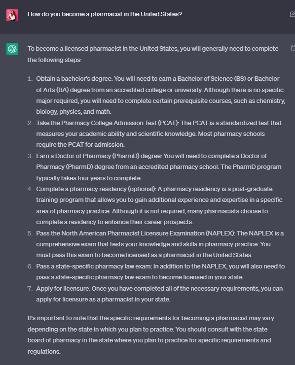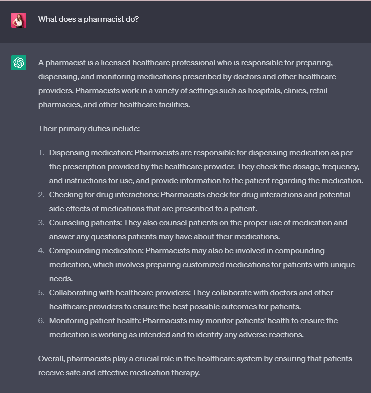 AI is currently a hot topic given its ability to improve and change how information is obtained and processed, but how well does it know the profession of pharmacy? Can you rely on the information it provides you about being a pharmacist? Well today I am answering these questions by asking ChatGPT 7 questions about the pharmacy profession and using my 11 years of pharmacy experience to evaluate the answer.