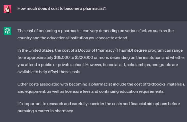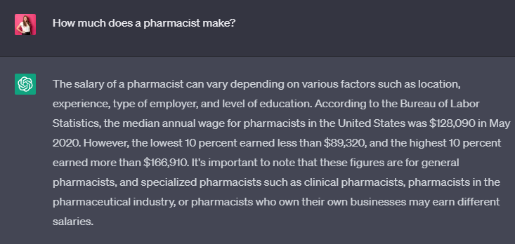 I would like to mention, like ChatGPT said, these numbers are very general and may have increased slightly since 2020 due to inflation. Starting salaries in certain pharmacy jobs such as industry are typically higher and pharmacists in management positions can often make over $200,000 per year. Unfortunately, there isn’t much salary growth if you maintain a staff pharmacist position long term.